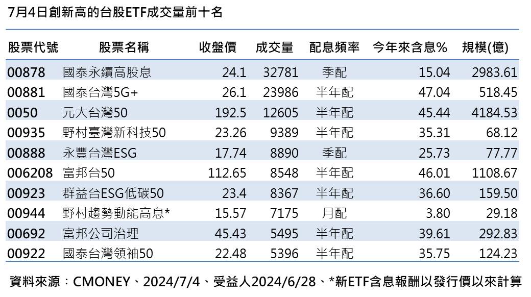 股價今天創新高的台股ETF,還包括野村臺灣新科技50(00935)、永豐台灣ESG(00888)、富邦台50(006208)、野村趨勢動能高息(00944)、富邦公司治理(00692)、國泰台灣領袖50(00922)。