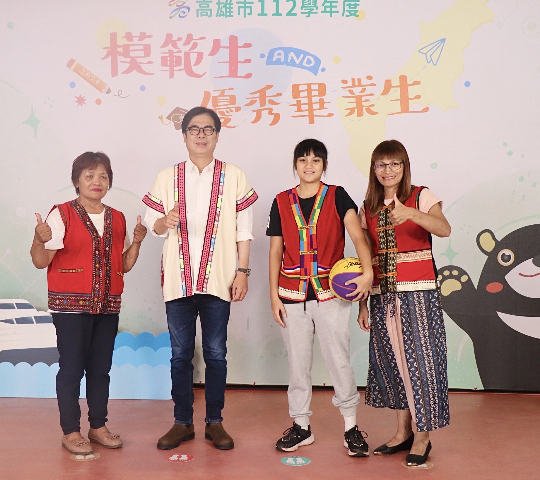 ↑圖說:那瑪夏區民生國小盧忻慈同學(右二)最喜歡打籃球,她特別拿著籃球與市長陳其邁合影。(圖片來源:高雄市教育局提供)
