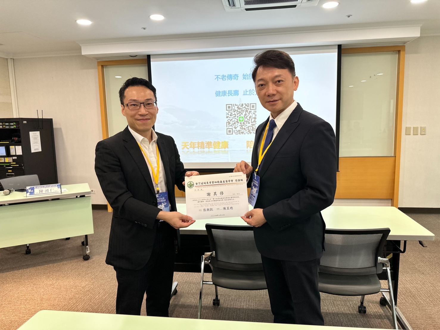 圖說:中華民國臨床非侵襲癌治療研究學會理事長陳湧仁醫師(左)頒發感謝狀給美國西德保國際專業證照培訓聯盟機構德華修辦事處處長謝其修(右)。圖/天年健康國際股份有限公司提供