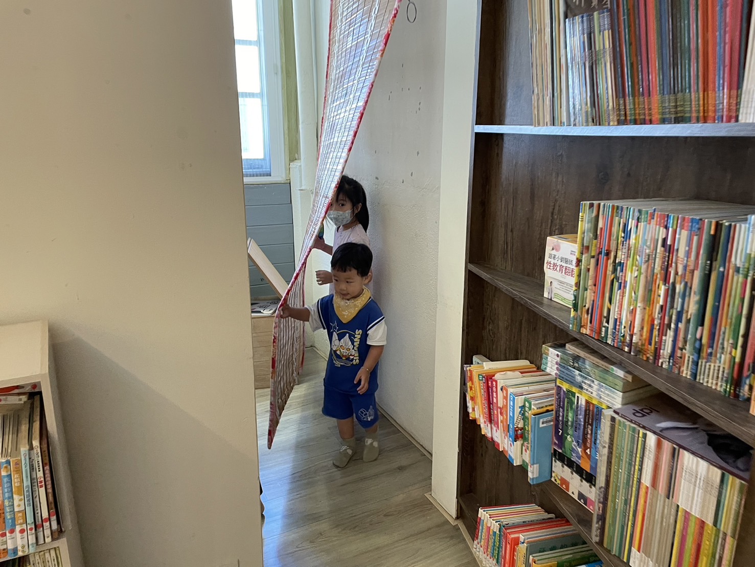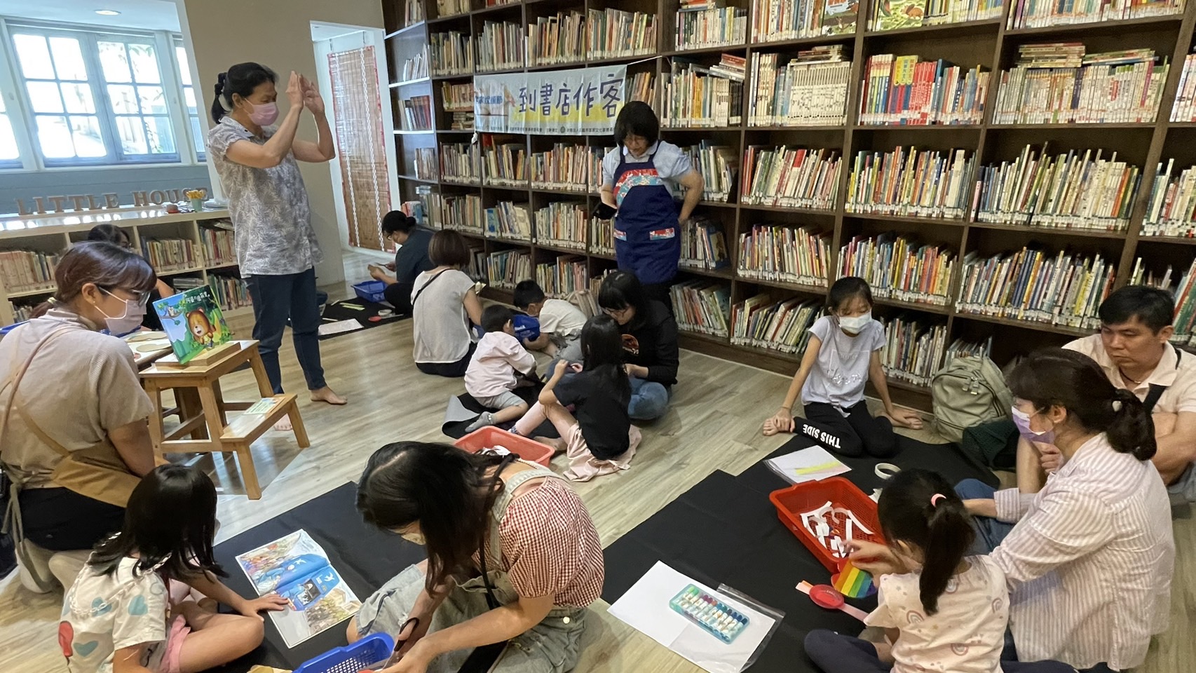 大小讀者一同來到高雄市苓雅區小房子書舖「作客」,現場佈置了油紙傘、藍染、竹門簾、客家藍衫等傳統工藝品,交織出一片客家書香的世界。林昕頤老師生動的說故事表演讓家長和孩子們聽得津津有味,蔡淑娟老師帶領的竹編手作活動更是讓小朋友們在歡笑中學習手眼協調,認識客家族群傳統工藝智慧。