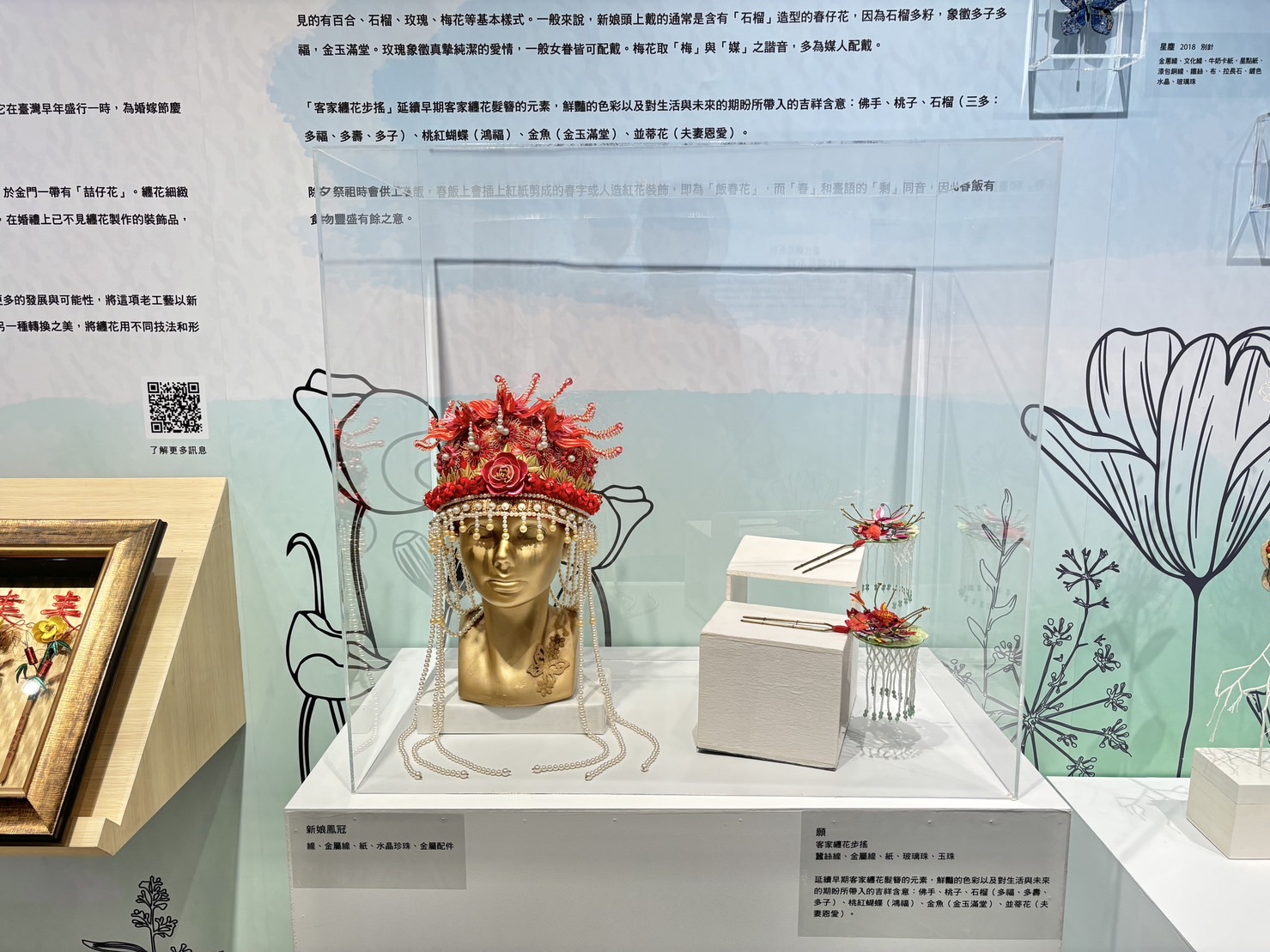 纏花在不同地區、族群有不同的稱呼,在閩南稱為「春仔花」,客家稱為「纏花」,於金門一帶稱之「吉花」。纏花細緻典雅,是具有相當豐富文化內涵的民間手工藝,因需要耗費大量的時間製作,隨著時代的推移,在婚禮上已不見纏花製作的裝飾品,此項技藝已逐漸失傳。高雄翰品酒店特別邀請藝術家黃珮萱老師展出35件作品,一件件纏花創作結合傳統與創新的藝術表現,讓參觀民眾感受纏花工藝的細緻與瑰麗。像是「客家纏花步搖」延續早期客家纏花髮簪的元素,鮮豔的色彩以及對生活與未來的期盼所帶入的吉祥含意,佛手、桃子、石榴表示多福、多壽、多子,桃紅蝴蝶象徵鴻福,金魚代表金玉滿堂,並蒂花寓意夫妻恩愛。