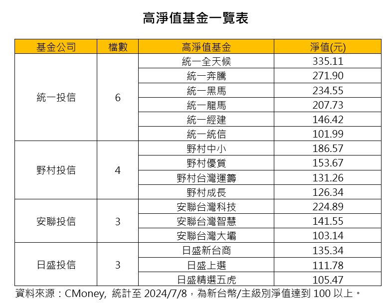 高淨值基金還包括野村中小基金、安聯台灣科技基金、日盛新台商基金等,都是投資人熟知的老字牌明星基金。