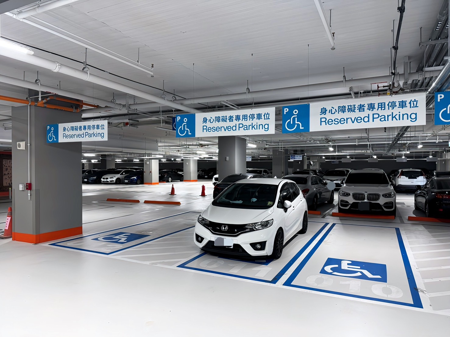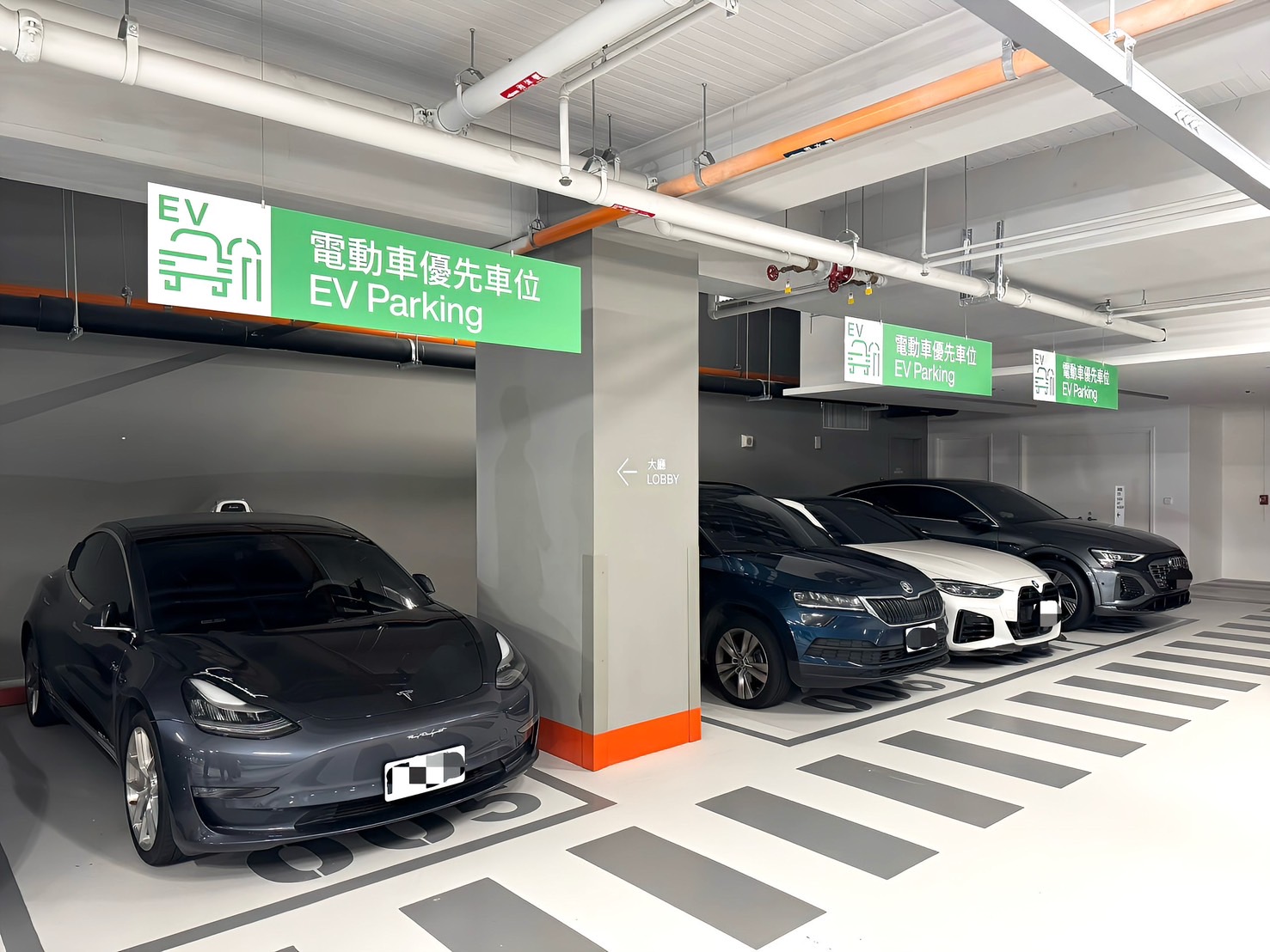 富邦人壽總部新大樓,位於富邦信義A25園區,鄰近台北捷運市府站,停車場設有電動車充電樁、無障礙停車位(如上圖,富邦人壽提供), B1大廳為下沉式戶外花園,有自然光線及景觀造景,走進2~13樓辦公室,隨處可見綠色植栽,並設有哺乳室,各樓層亦提供共享座位、會議討論空間。