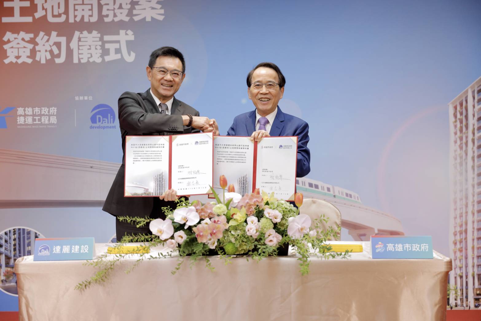 ↑圖說:副市長林欽榮(右)代表市府與達麗建設事業股份有限公司董事長謝志長(左)簽訂開發合約(圖片來源:高雄市捷運局提供)