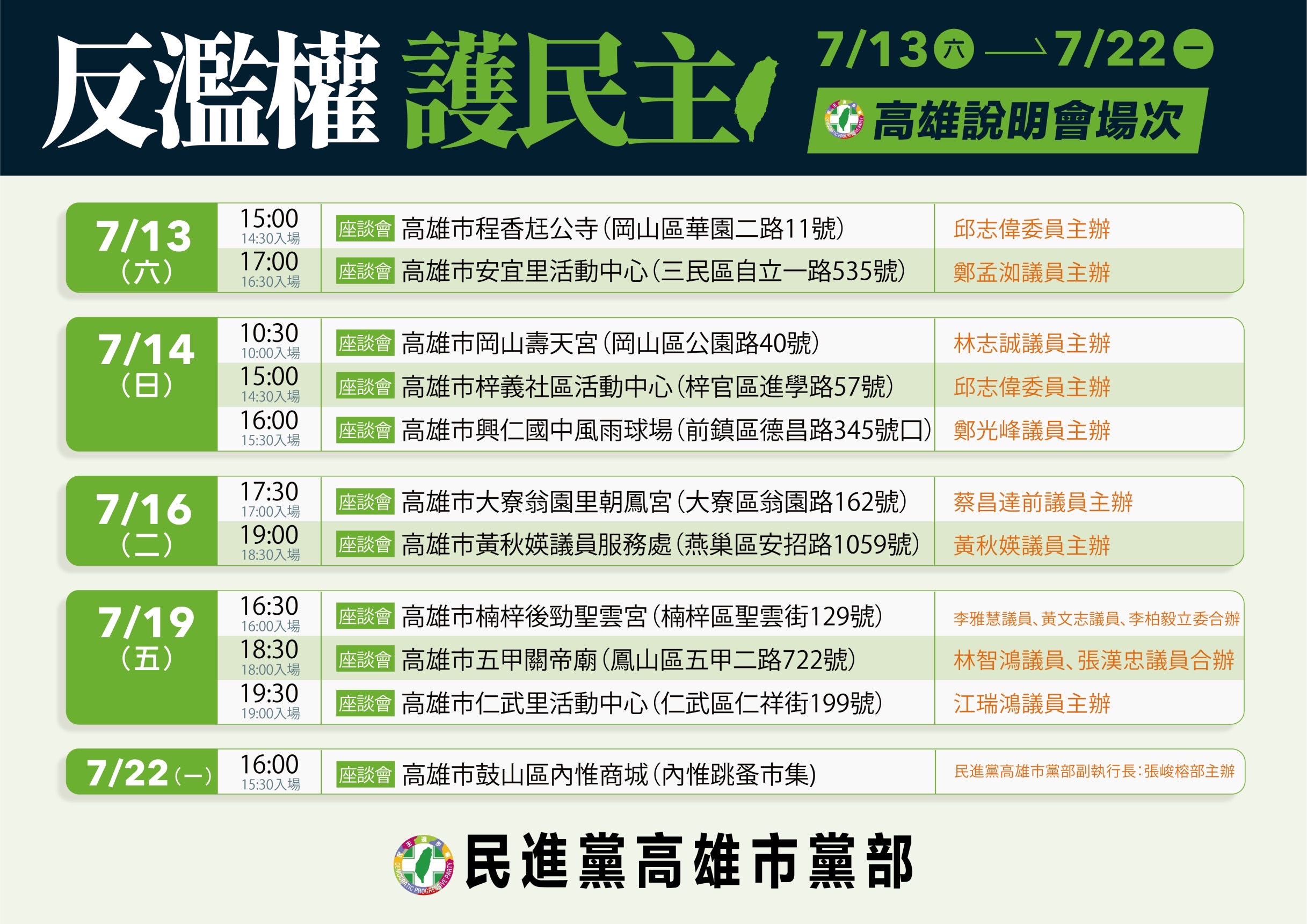 自13日起高雄「反濫權護民主」宣講場次依序為:13日下午三時在高雄市程香尪公寺由邱志偉委員主辦,下午五點在三民區安宜里活動中心由鄭孟洳議員主辦。14日上午十點半在岡山壽天宮由林志誠議員主辦,下午三點在梓義社區活動中心由邱志偉委員主辦,下午四點在興仁國中風雨球場由鄭光峰議員主辦。16日下午五點半在大寮翁園里朝鳳宮由前議員蔡昌達主辦,下午七點在黃秋媖服務處。19日下午四點半在楠梓後勁聖雲宮由李雅慧議員、黃文志議員及李柏毅委員共同主辦;下午六點半在五甲關帝廟由林智鴻及張漢忠議員聯合主辦,下午七點半在仁武里活動中心由江瑞鴻議員主辦。22日下午四點由市黨部副執行長張峻榕在內惟跳蚤市集舉辦。