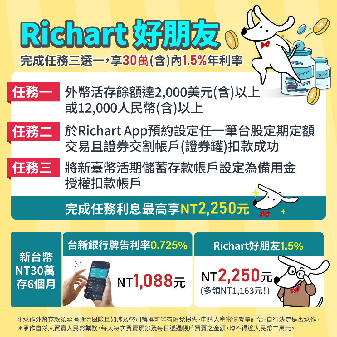 至於Richart既有客戶,台新也推出3項簡單的指定任務(如下表),只需完成其中一項,即可享長達六個月、新臺幣30萬元內的1.5%利率,存滿最高可領2250元,讓存款利息成為生活小確幸。