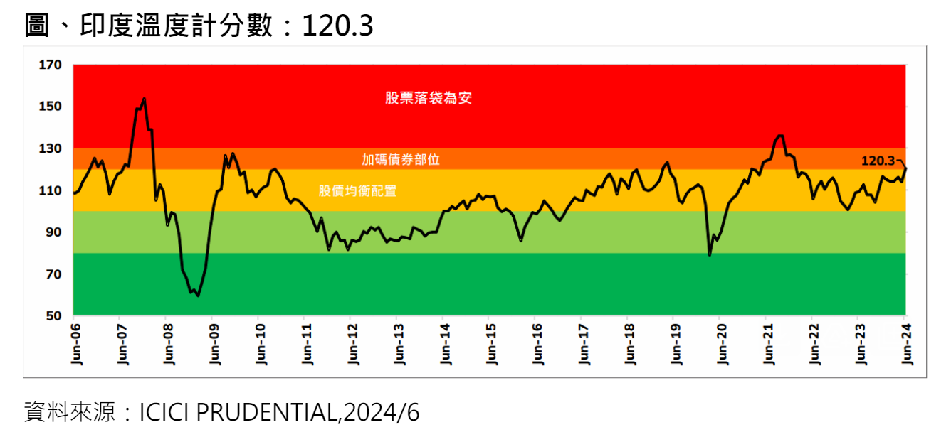 根據瀚亞投資-印度溫度計最新指標顯示,6月明顯上升至120.3,處「加碼債券部位區」,隨股市評價上漲,從股債均衡配置區來到加碼債券部位區。