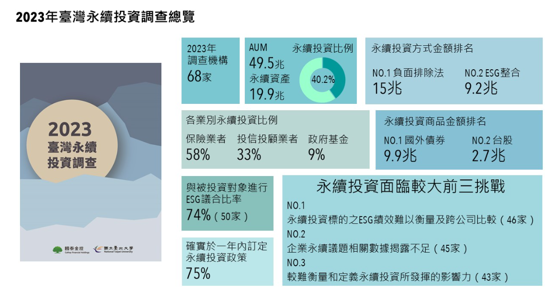 臺北大學是在國泰金控的贊助下,執行「臺灣永續投資調查」,2020年開始調查邀請臺灣99家機構投資人參與,其中包括26家保險業者、59家投信投顧業者以及四家政府基金,並委由金管會、證交所及同業公會協助與機構投資人溝通。之後並於2021至2023年,每年均進行調查,這次又贊助臺北大學全球變遷與永續科學研究團隊,統整過去四年調查結果,製作《臺灣永續投資調查2020-2023四年趨勢分析》。