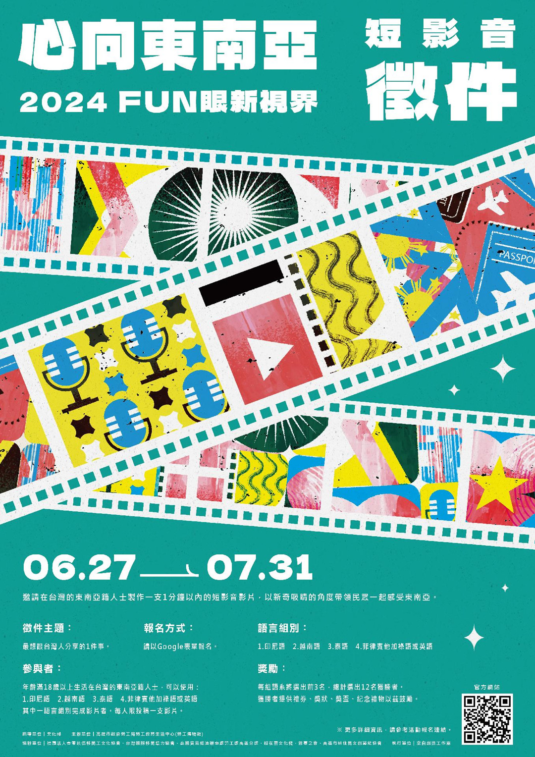 高雄勞工博物館舉辦「心向東南亞~Fun眼新視界」短影音徵件活動,邀請年滿18歲在台灣工作、求學及生活的東南亞朋友,以「最想跟台灣人分享的一件事」為主題,用他加祿語、印尼語、越南語或泰語等4種語言拍攝1分鐘短影音,於7月31日前填妥活動報名表並上傳影片,每組語系報名上限數為15組,額滿為止。勞博館將請東南亞知名網紅擔任評審分組進行評選,每一語組將選出3件優勝作品,優勝者將可獲得精美禮品,並受邀出席勞工博物館東南亞文化日活動分享影片。