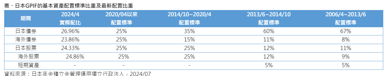 GPIF調整投資組合的預計生效日自2025年4月1 日起,第一金投信表示,過往投資機構的行動通常會早於GPIF基金權重調整的時點,以讓投資組合權重調整的過渡期能更加順暢,根據日本年金積立金管理運用獨立行政法人資料顯示,2023年會計年度於今年4月結束時,日股佔比僅24.33%,貼近近年的標準配置比重,同時也較2013年6月以前的標準配置比重,有近翻倍的成長;2023年會計年度GPIF創造22.67%的年度投資收益率水準,遠高於從2000年開始的年化收益率僅4.36%。