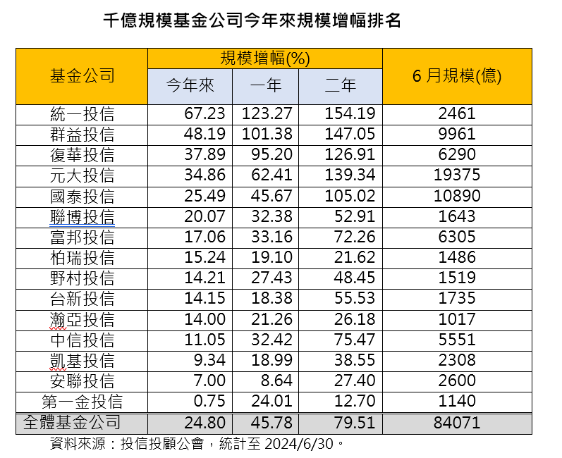 群益投信基金規模今年也大增48.1%,在業界居次,截至6月底的規模來到9961億元,成長顯著;第三名則是復華投信,今年基金規模大增37.8%,規模來到6290億元。