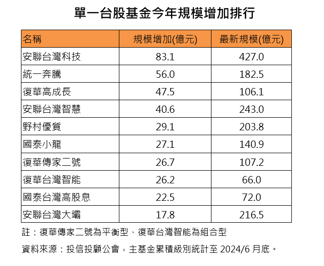 如果來看單一基金規模增減,包括安聯台灣科技、統一奔騰、復華高成長、野村優質、國泰小龍等各家規模超過百億的旗艦招牌基金,今年規模也都有成長。