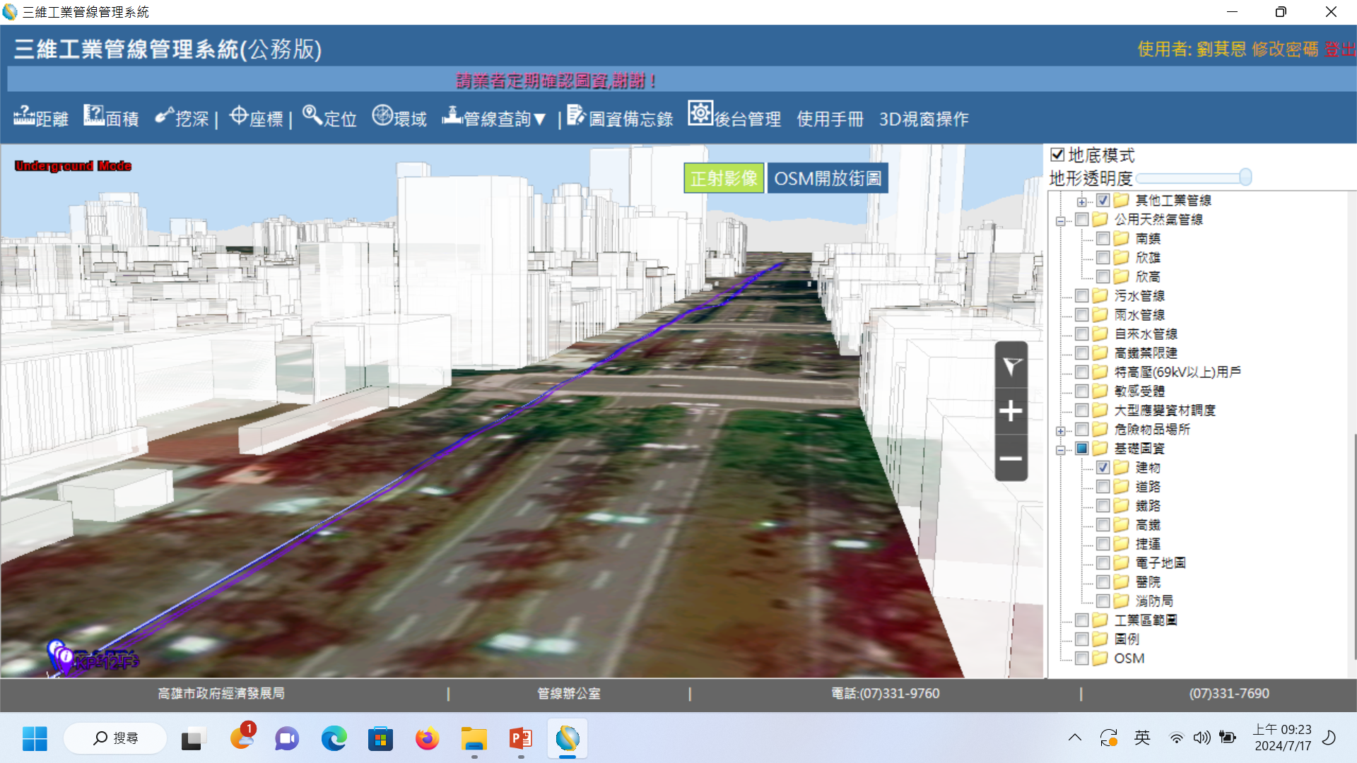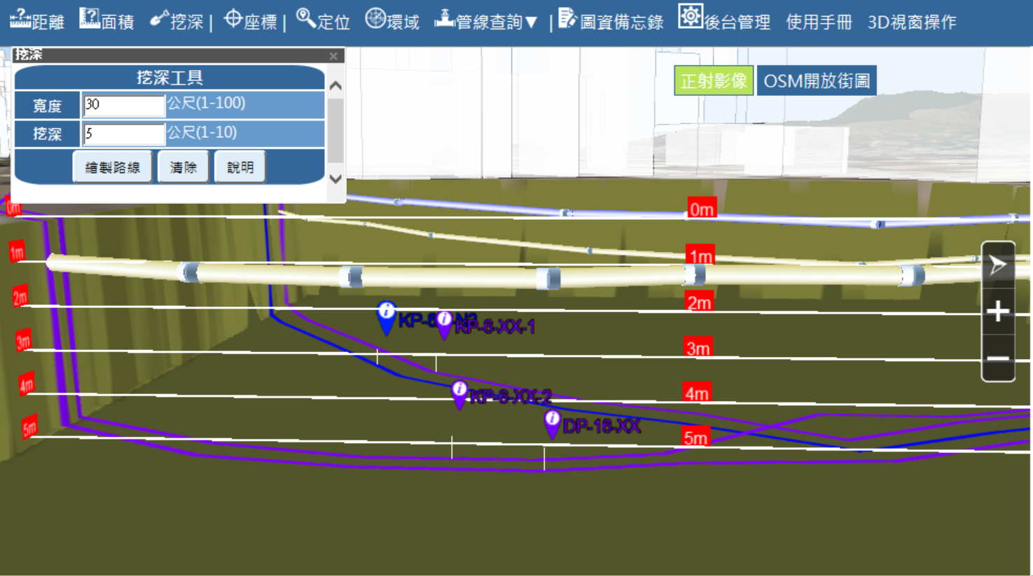 ↑圖說:三維圖資搭配局部挖深工具功能,可迅速釐清目前所在一定範圍內的地下管線配置與路徑走向與地面上空間相對位置。(圖片來源:高雄市經發局提供)
