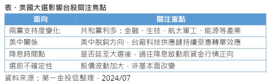 第一金投信指出,台股受惠AI、半導體的快速發展與爆發性成長需求,半導體龍頭、科技股價狂飆,受到川普選舉期間強勢言論影響,美股、科技股的大選修正行情提前到來,拖累台股走勢,下半年股價震盪幅度加大,回顧過往川普執政時期,整體股價受其言論影響,確實經常出現較大幅度上、下波動。