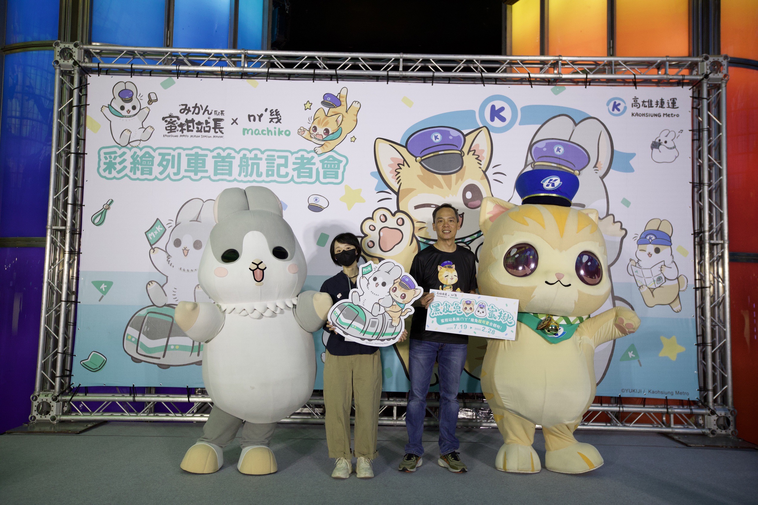 ↑圖說:蜜柑站長與 ㄇㄚˊ 幾兔19日在高雄捷運美麗島站,舉行彩繪列車首航聯名記者會。(圖片來源/高捷公司提供)