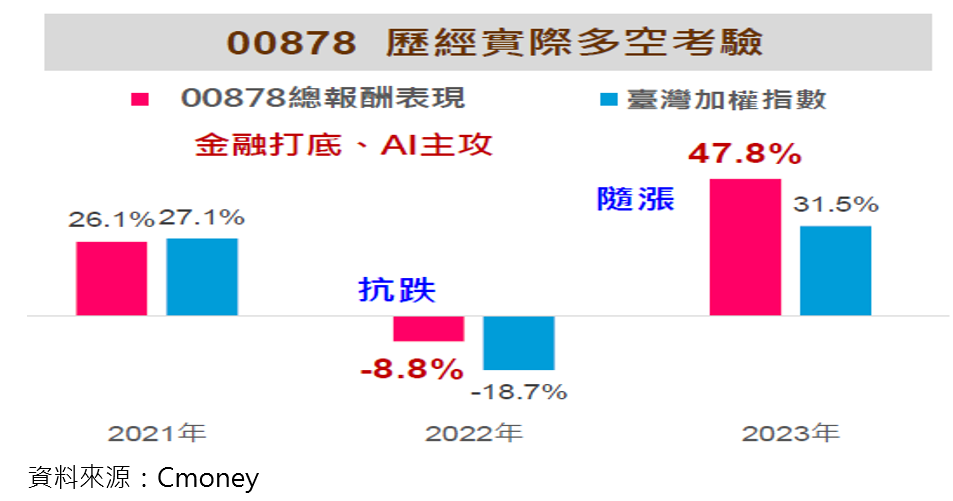 00878成立4年以來,經歷股市多空洗禮,追蹤的標的指數「MSCI台灣永續高股息指數」,2021年含息報酬率26.1%,接近同年台股的漲幅27.1%;2022年台股下跌18.7%,永續高股息指數則是下跌8.8%,相對抗跌;2023年是永續高股息指數爆發的一年,含息報酬率高達47.8%,勝過同年台股的漲幅31.5%。