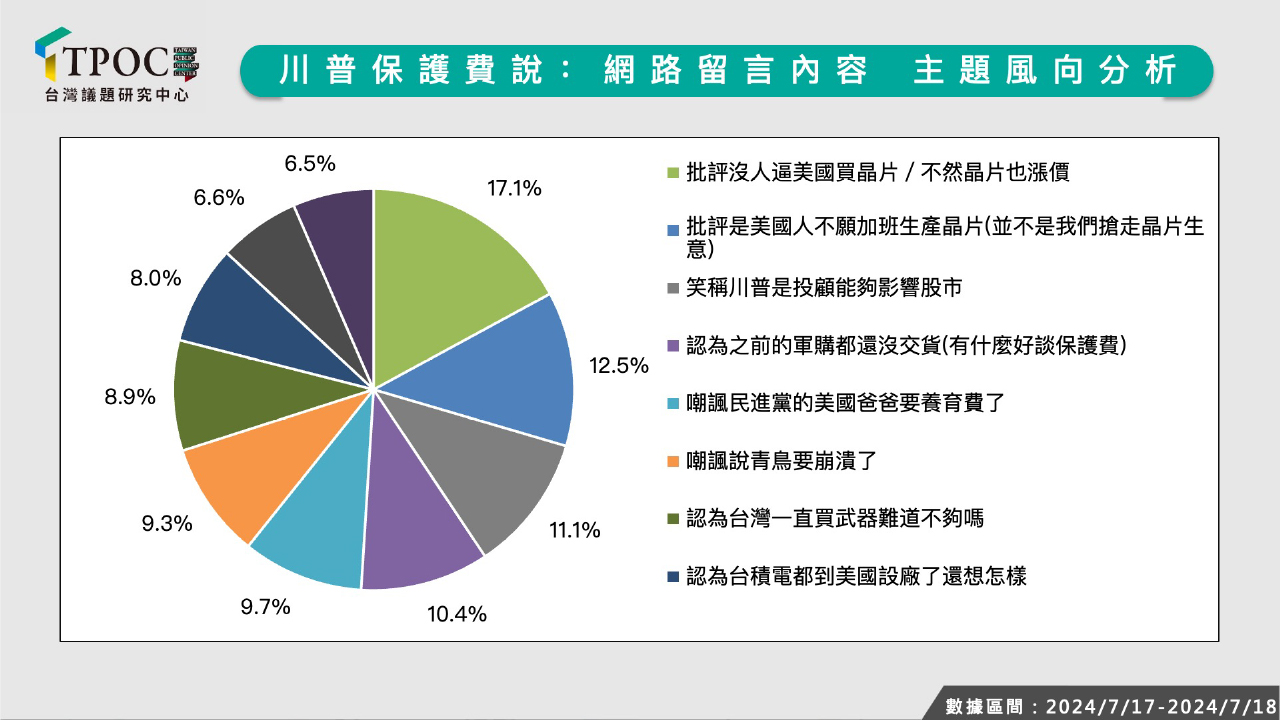 川普拋出保護費說,震撼台灣政壇,連股市也受到影響,不少人擔憂台美關係惡化,或憂慮「疑美論」伺機再起。TPOC台灣議題研究中心透過QuickseeK快析輿情資料庫,觀察川普發言之後,網路輿情留言內容的主題風向,結果發現,多數網友並不贊同川普的發言,其中以「批評沒人逼美國買晶片」聲量佔比17.1%最高,直指「不是台灣搶走晶片生意,而是美國人不願加班生產晶片」佔比12.5%居次,表示「川普是投顧能夠影響股市」佔比11.1%第三,或者指出「之前軍購還沒交貨,有什麼好談保護費?」佔比10.4%居四。