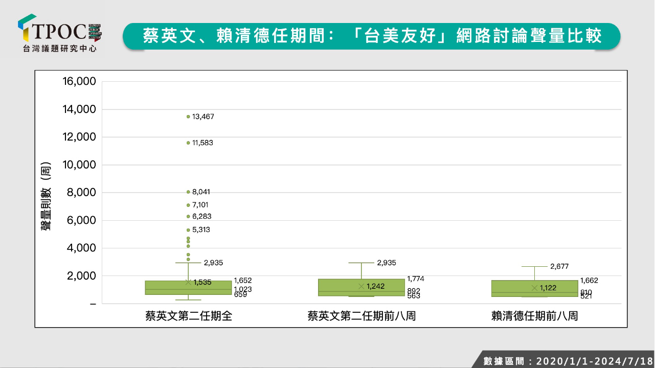 值得一提的是,「台美友好」的輿情討論在蔡英文任內時不時有「聲量爆棚」的表現,例如2021年正逢新冠疫情高峰,當時美國政府捐贈250萬劑疫苗,蔡英文表示這是美國好朋友「患難見真情」的表現,又如2022美國前聯邦眾議院議長裴洛西來台,蔡英文強調台灣與美國是堅實的夥伴,都引發出大量的網友回覆「台美友好」、「台美友誼堅若磐石」,也使「台美友好」相關話題數度繳出單周破萬則聲量的成績單。相較之下,賴清德上任至今尚未展現出能夠引發網路爆炸性呼應「台美友好」的能力。