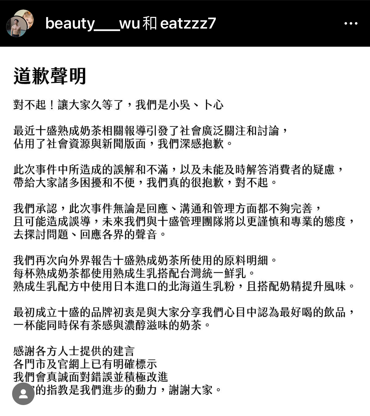 眼看風波越演越烈,兩人最終還是在稍晚一起發出聲明「感謝各方人士提供的建言,各門市及官網上已有明確標示,我們會真誠面對錯誤並積極改進」。