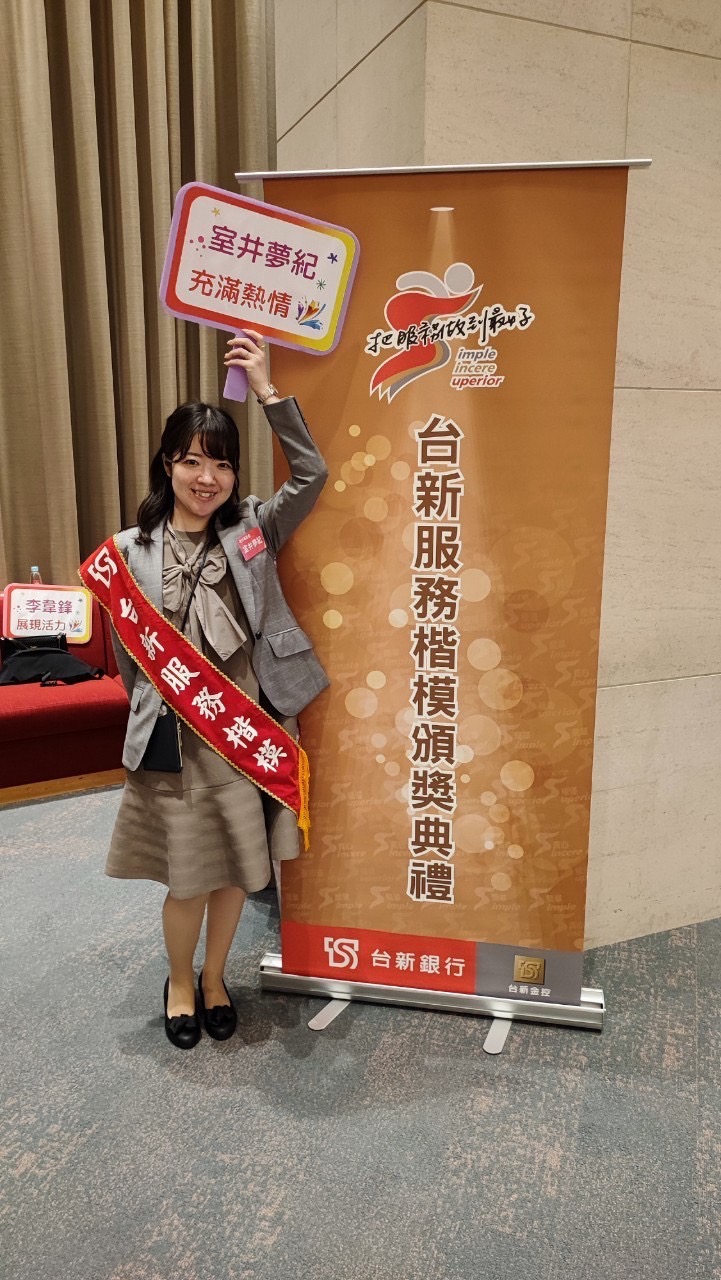 張俊明說,如果人力不足,會從台灣外派員工駐日,或是機動調派東京分行同仁支援,像是日籍員工室井夢紀,還曾獲台新銀服務楷模員工表揚(如上圖,台新銀提供)。