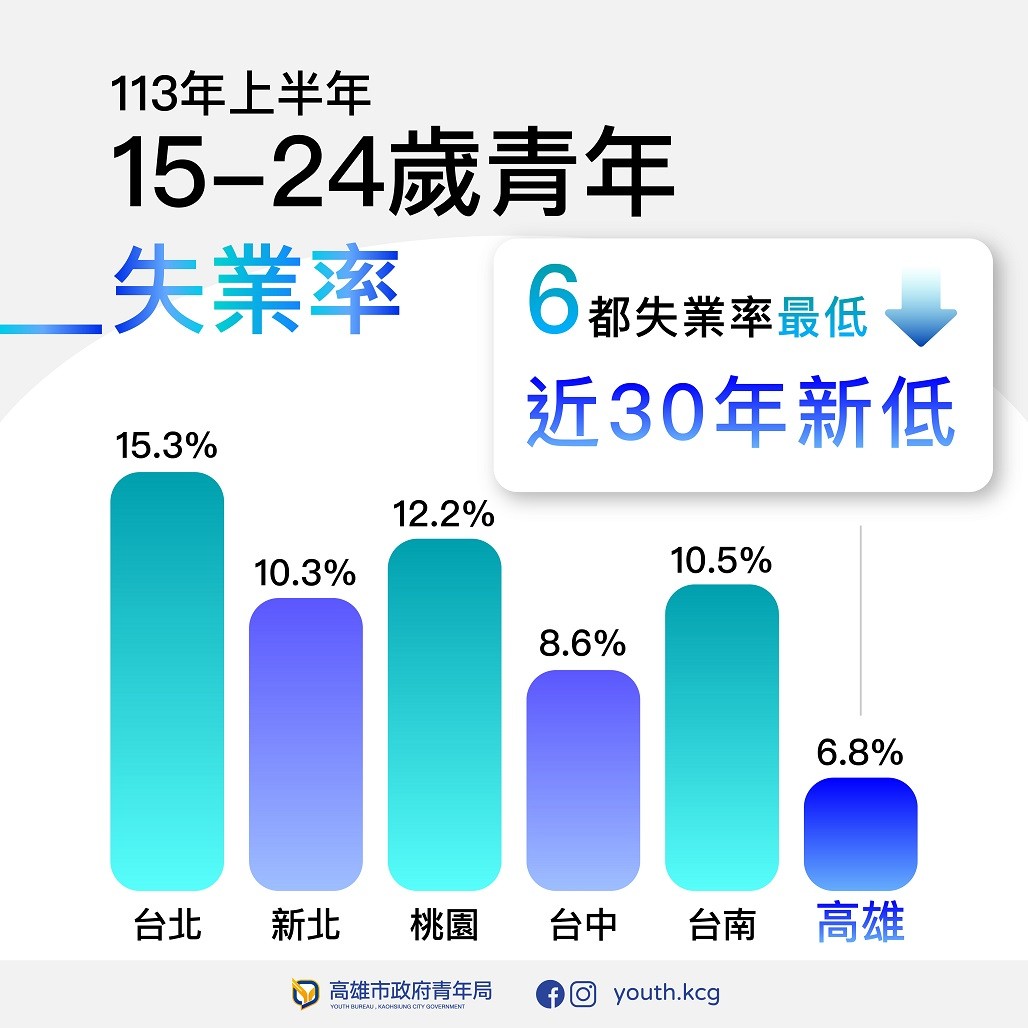 依據行政院主計總處22日公布最新統計數據,113年上半年全國失業率為3.36%,高雄市失業率3.3%,較上期減少0.1%,總體失業率為六都最低。其中,15-24歲之失業率為6.8%,更是六都最低,同時創下近30年新低。