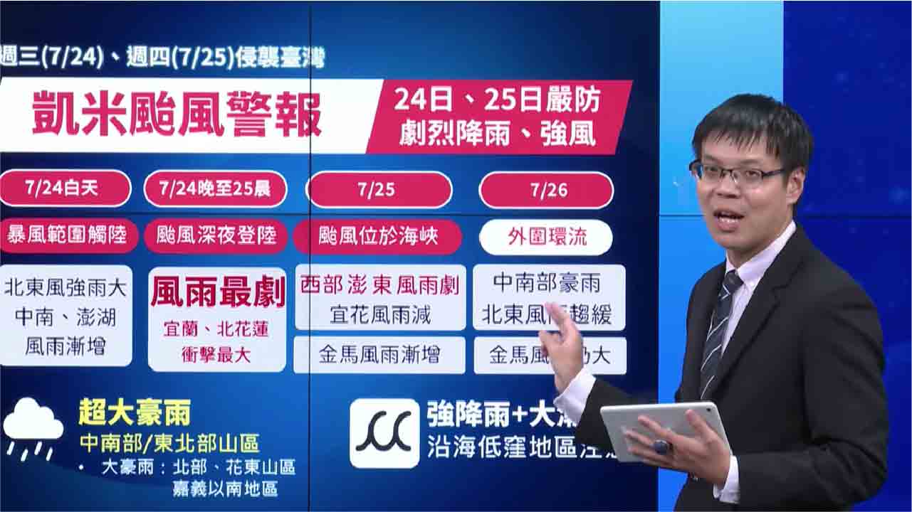 隨著颱風凱米的逼近,中央氣象署今(24)日14:40召開線上記者會,針對即將來臨的強風豪雨進行詳細說明。