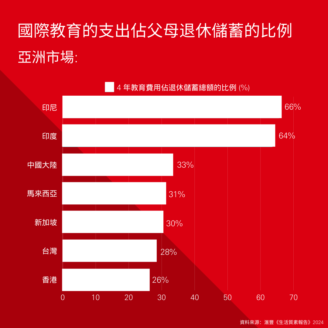 這項調查訪問了全球包含台灣共11個市場内約1萬1500個富裕家庭,受訪者表示,在美國、英國、澳洲、加拿大這些熱門地區留學,若要完成三至四年教育,每名子女所需費用在19.2萬至25.6萬美元之間 (約新台幣622.6萬至830.2萬元),佔台灣父母退休儲蓄的28%;對印度和印尼的家庭來說,海外教育的支出更高達家長退休儲蓄的66%。