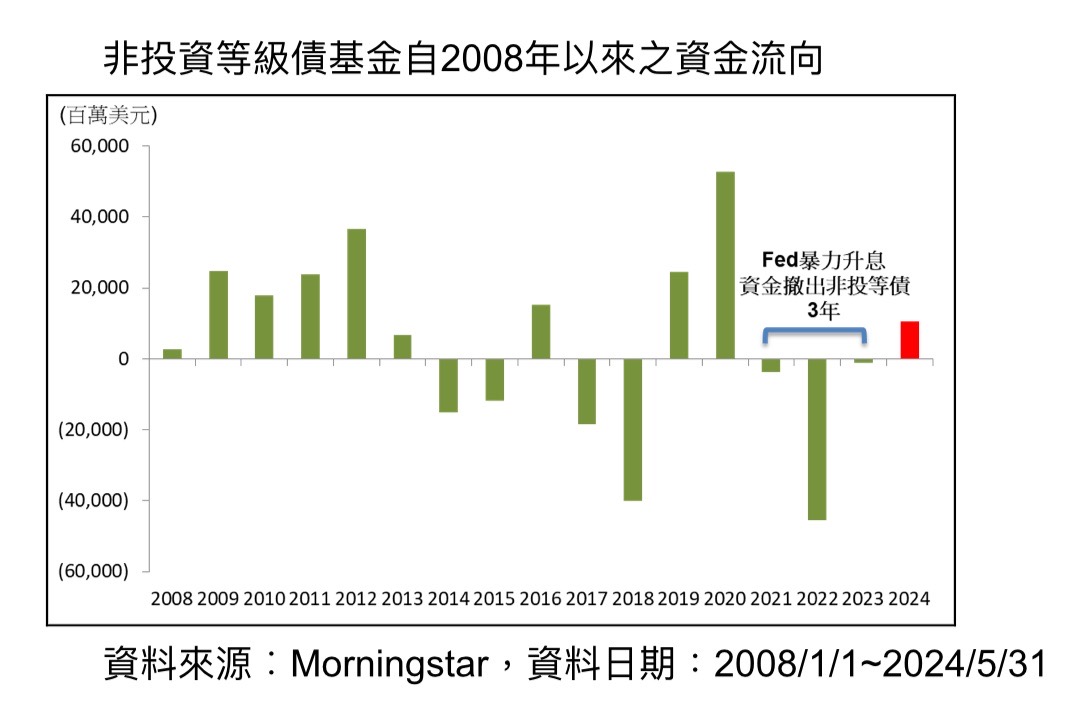 群益00953B經理人李忠泰指出,自2008年以來,全球非投資等級債位曾連續三年呈現淨流出,資金淨流出503.49億美元,不過今年以來至五月底資料顯示,市場資金已回流105.81億美元到非投資等級債。