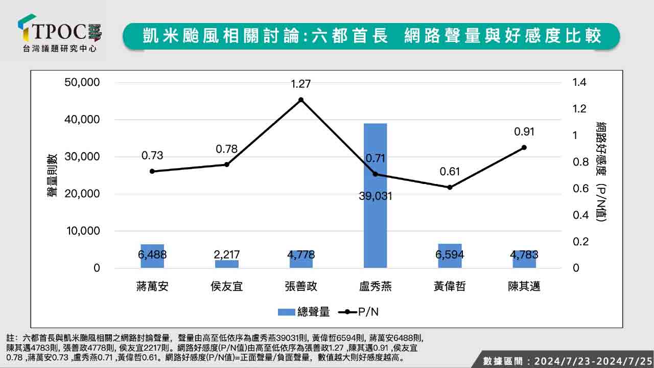 在這次防颱大作戰中,六都現任市長究竟表現如何?TPOC台灣議題研究中心透過QuickseeK快析輿情資料庫,蒐集本月23日至25日凱米颱風侵襲台灣期間,六都首長與凱米颱風相關的網路輿情聲量表現,在總聲量方面,為了防颱準備,落地美國6個小時就匆忙搭機返台的台中市長盧秀燕拔得頭籌,獲得超過39,031則聲量;其次是台南市長黃偉哲(6,594則)與台北市長蔣萬安(6,488則)難分軒輊;第四名是高雄市長陳其邁(4,783則)與桃園市長張善政(4,778則),以及聲量敬陪末座的新北市長侯友宜(2,217則)。