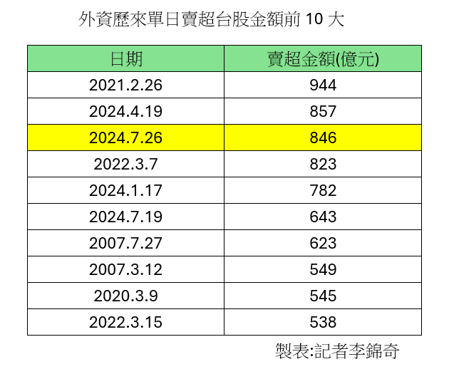 外資今天也瘋狂倒貨,狂砍846億元,寫台股史上第三大單日賣超,僅次於2021年2月26日的944億元,以及今年4月19日的857億元。