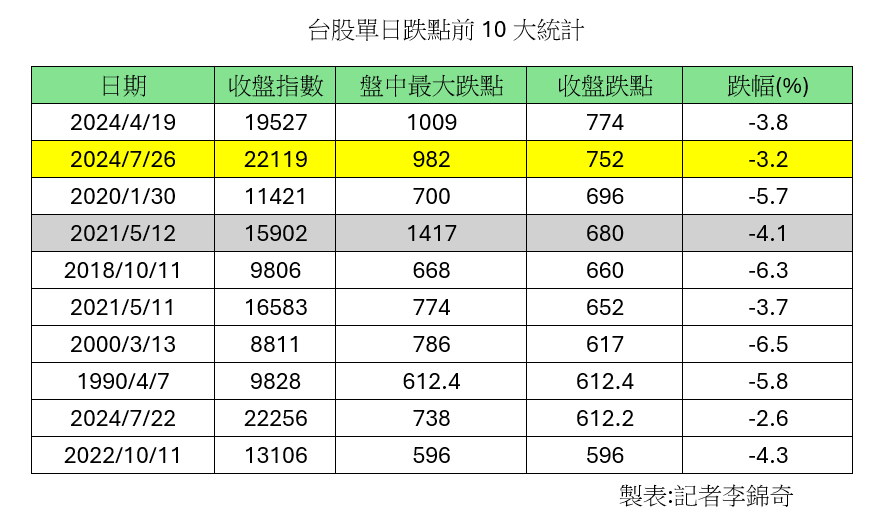 台股史上收盤最大跌點發生在今年4月19日,當天收盤下跌774點,盤中一度狂殺1009點;但盤中最大跌點記錄,其實出現在另一天(2021年5月12日),當天大跌1417點,是史上首見跌破千點,當時曾經見證過股市慘況的投資人,應該都還有印象。