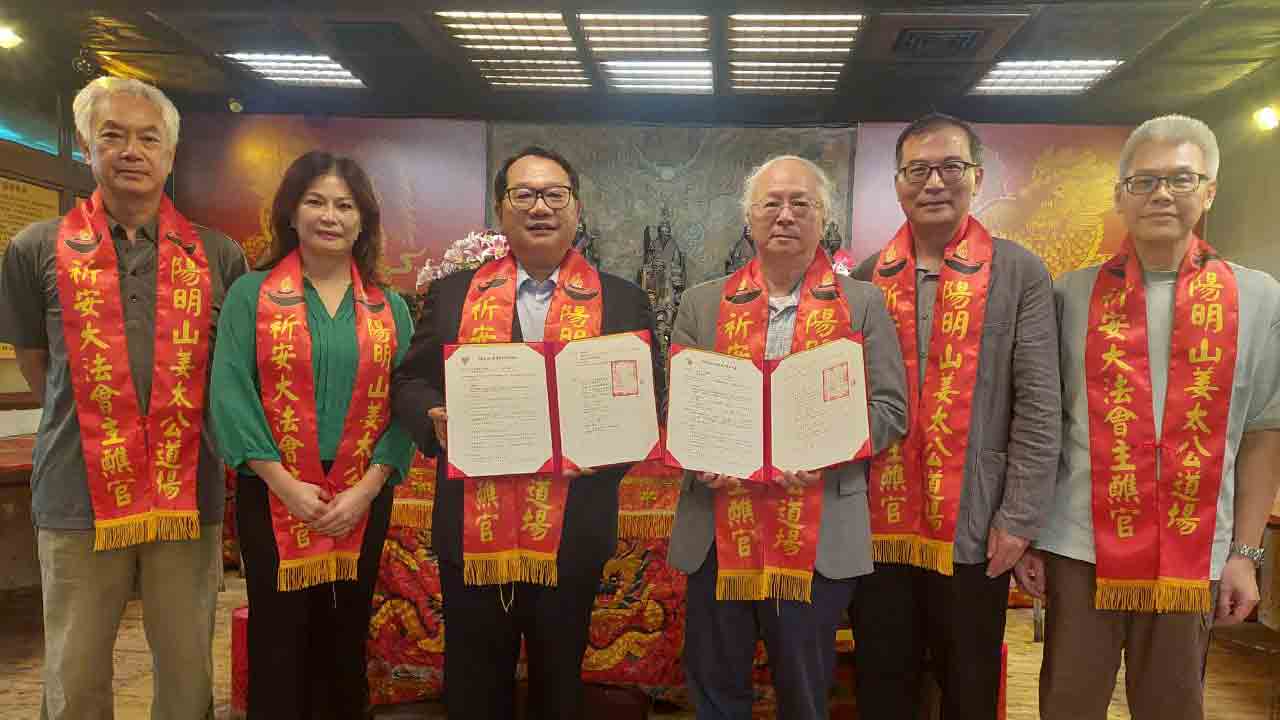 ↑圖說:陽明山姜太公道場與文化大學將聯手舉辦「第二屆姜太公世界道家論壇」,文化大學文學院院長王俊彥教授(右三)、中華道家世界協會理事長陳桂姍(左二)、陽明山姜太公道場主席羅世新(左三)出席簽約儀式。(圖片來源:陽明山姜太公道場提供)