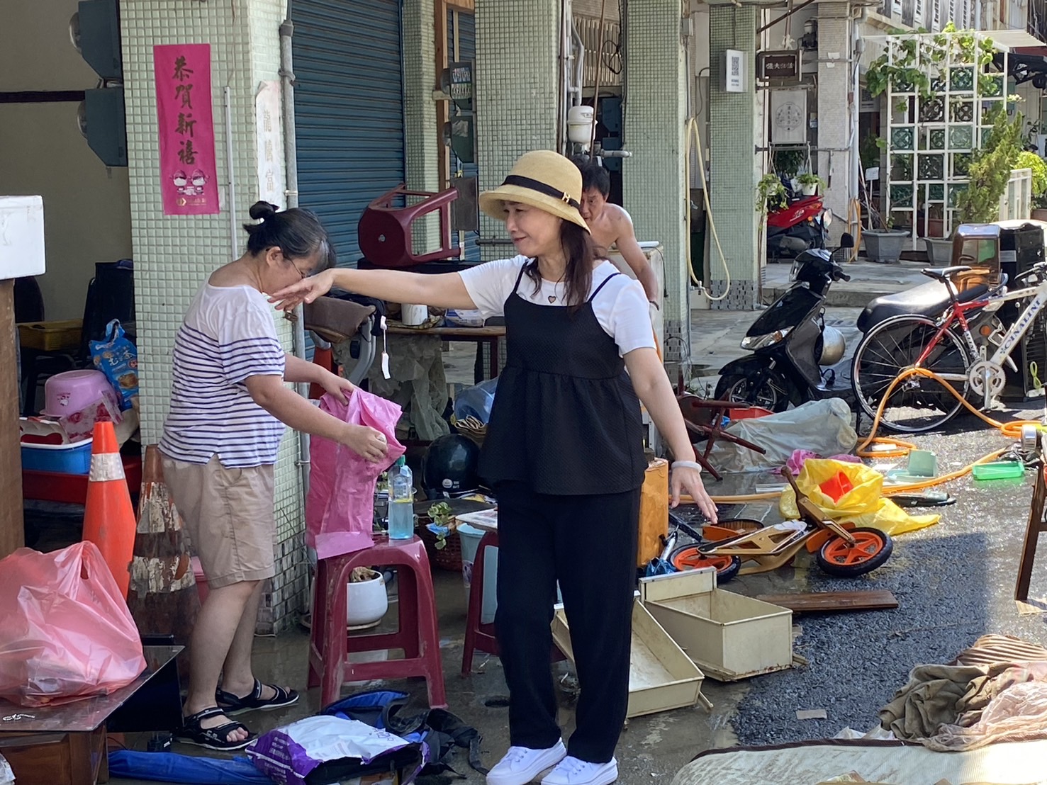 ↑圖說:楊瑞霞到訪關懷美濃永安老街淹水戶,居住外地的家人趁著假日返鄉ㄧ起清理家園(圖片來源:高雄市客家事務委員會提供)