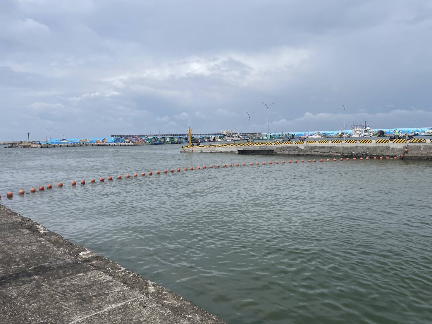 ↑圖說:海洋局架設攔木網,將大量漂流木攔在港嘴,確保港內漁船停泊安全。(圖片來源:高雄市海洋局提供)