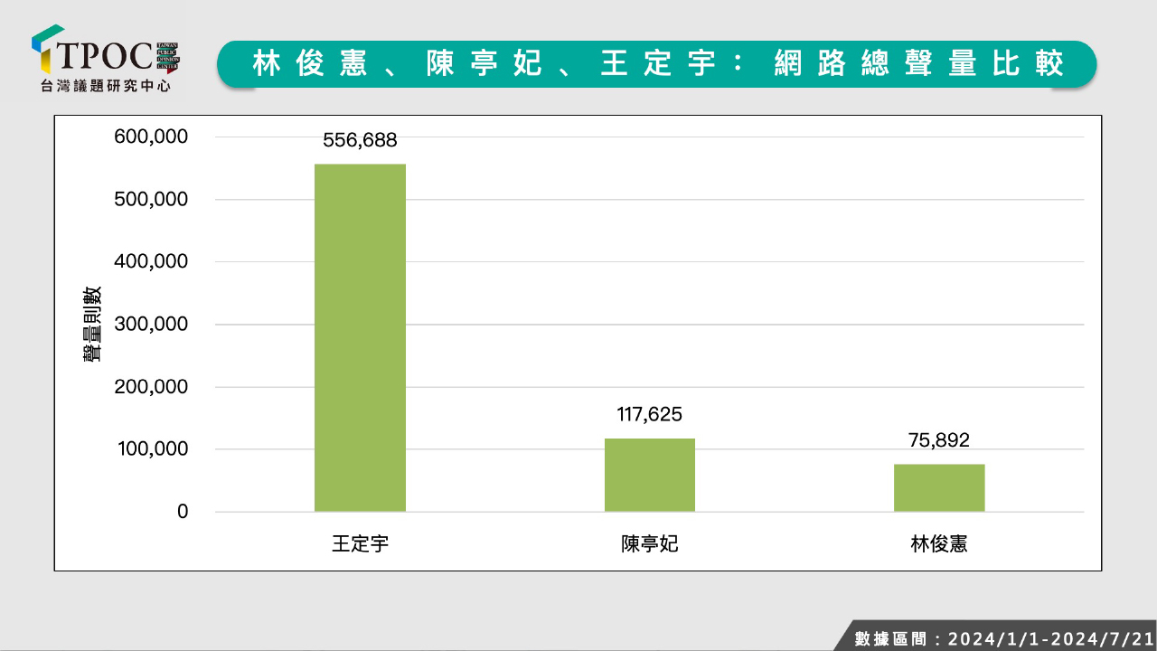 為了評估王定宇、林俊憲、陳亭妃三人的網路「空戰力」,TPOC台灣議題研究中心透過QuickseeK快析輿情資料庫,蒐集今年以來三人的網路聲量數據。數據結果顯示,王定宇憑藉積極的網路社群操作、頻繁拍攝影片評論時事,獲得超過55.6萬則聲量,遠超其他兩名對手,其次為陳亭妃以11.7萬則聲量緊追其後,反觀身為賴清德嫡系的林俊憲,總聲量只有7.5萬則左右。總體而言,三人的網路聲量比例為王定宇佔74%、陳亭妃16%、林俊憲10%。
