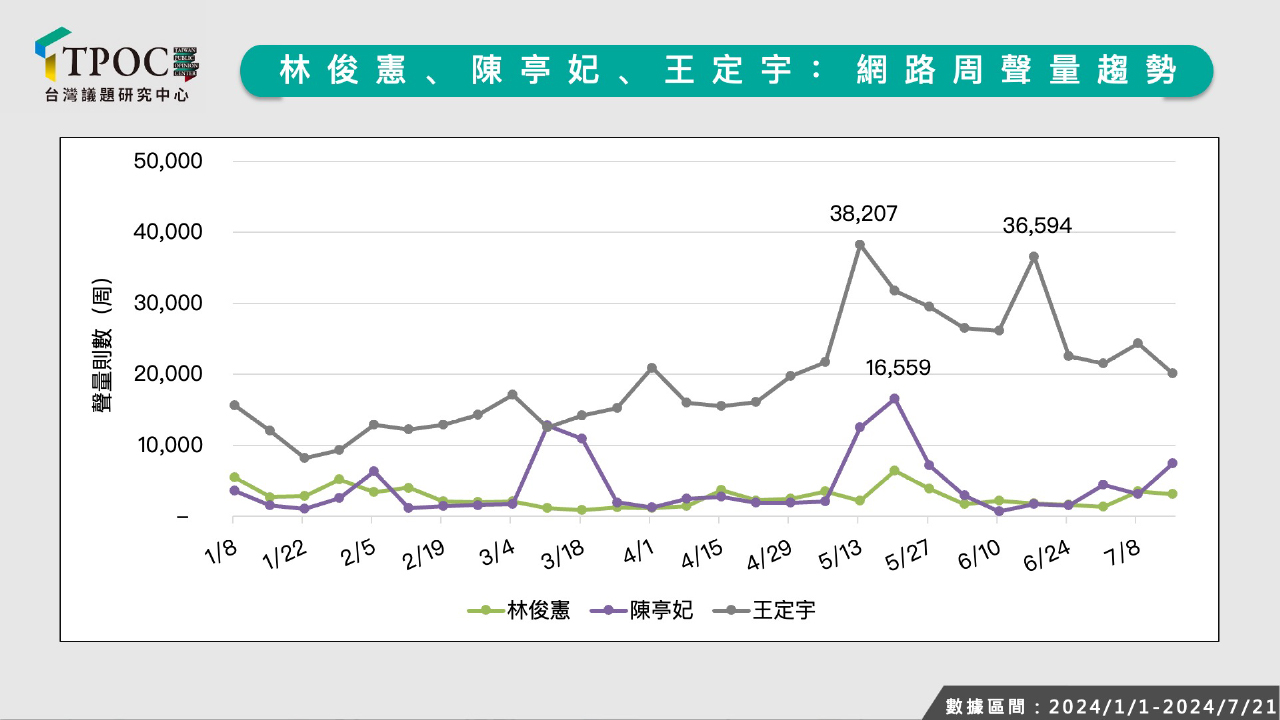 進一步分析三人今年以來各周的聲量趨勢,今年5月中旬後朝野立委為「國會改革」大動干格期間,王定宇、陳亭妃在議事過程都有不錯的聲量表現,其中,王定宇提出「反國會改革(國會擴權)」論述,有效將複雜的議事攻防簡化為一般民眾聽得懂的文字,說服支持者,也以軟性貼文感謝「青鳥」挺身而出,單周收穫3.8萬則聲量;陳亭妃則走「武鬥」路線,一度槓上國民黨立委徐巧芯、陳玉珍,甚至在衝突過程中被國民黨立委包圍,讓支持者們大感振奮,一周內累積1.6萬則聲量;相較之下,林俊憲雖也經常透過社群平台提出論述和觀點,並獲得媒體轉載報導,但在網路聲量方面,他的單周聲量未曾破萬則,表現明顯不如兩名競爭對手。