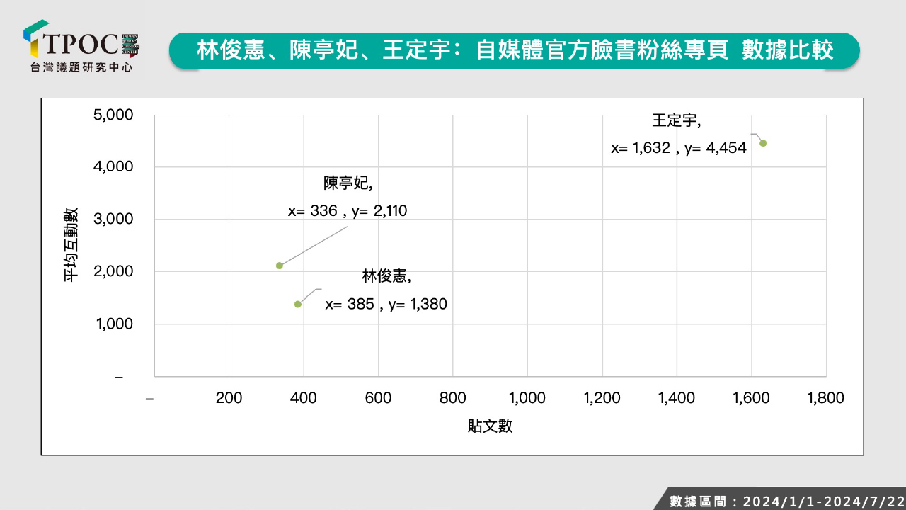 除了總體聲量外,三人在自身粉絲專頁的數據表現也有所差異,單就貼文數和平均互動數來觀察,王定宇臉書粉專從今年初至今的貼文數量高達1632則,內容產製量能相當驚人,貼文數量遠超陳亭妃的336則及林俊憲的385則。不僅如此,王定宇粉絲專頁累計互動數超過700萬則,每則貼文的平均互動數也有4400次左右,相對之下,陳亭妃每則貼文的平均只能創造2100次互動,林俊憲只有1300次左右。這顯示王定宇的粉絲動能較強,這也為日後選戰進入短兵相接、輿論戰階段時,提供穩定的戰力基礎。