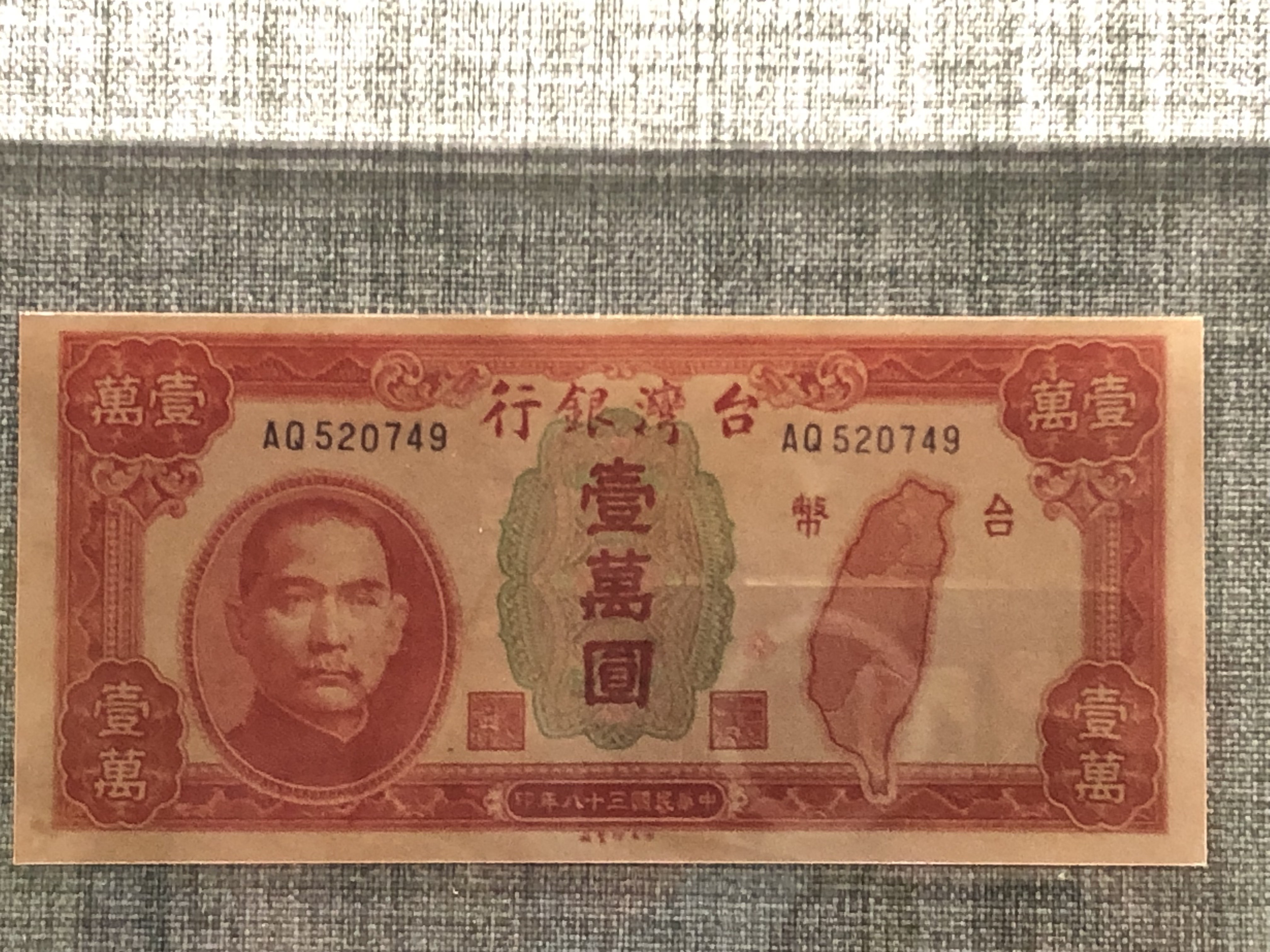 ▼圖說:一銀永續金融館珍藏民國38年的壹萬元面額的台幣紙鈔。(圖/記者李錦奇攝影)