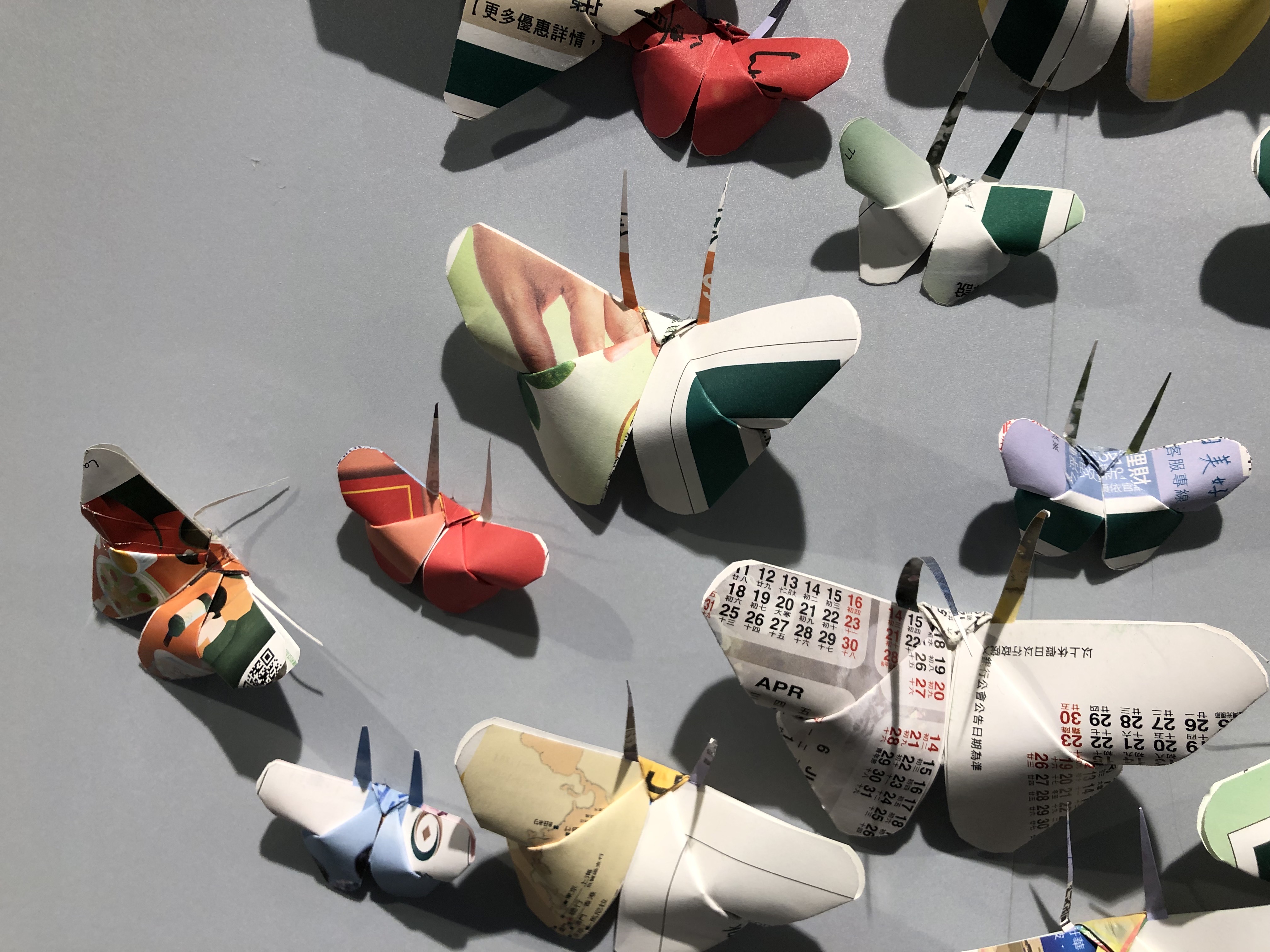 ▼圖說:一銀員工發揮美編專長,以再生紙折出蝴蝶造型,打造出別具特色的「福蝶」牆面。(圖/記者李錦奇攝影)