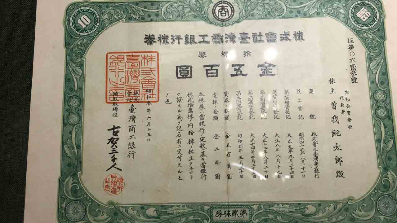 ▼圖說:1928年臺灣商工銀行發行每股50日圓,票面為10股共500日圓的股票。(圖/記者李錦奇攝影)