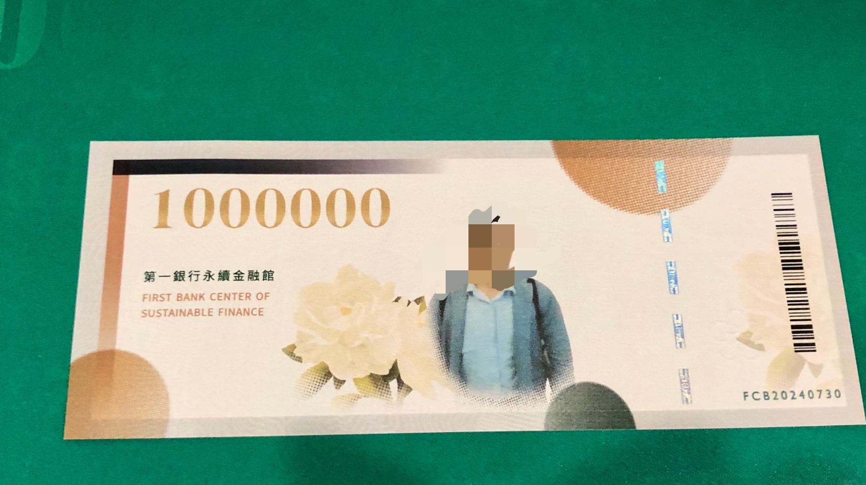 除了珍貴古物,永續金融館也有現代的數位銀行互動體驗,來賓可以拍照印製出個人專屬的玩具紙鈔,記者也實際測試,相當有趣,讓人印象深刻。(如下圖,馬賽克為去個資的後製效果,非原版紙鈔呈現,記者李錦奇攝影)