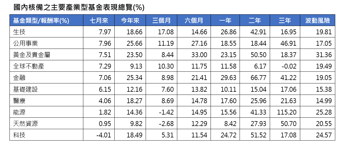 進一步來看,主要產業型基金當中,生技基金、公用事業基金7月表現最佳,平均漲幅分別為7.97%與7.96%;黃金及貴金屬基金漲幅7.51%緊追在後,扳回6月平均下跌5.6%的顏面。