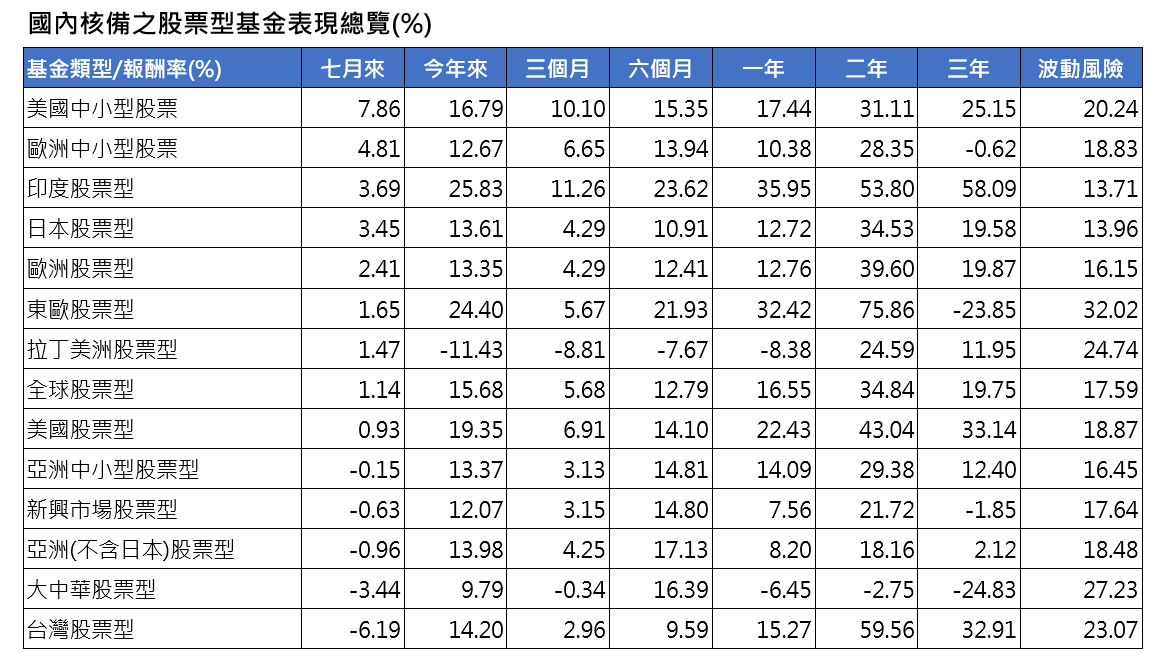 相對地,台股基金成為7月苦主,平均下跌6.1%,表現最差。