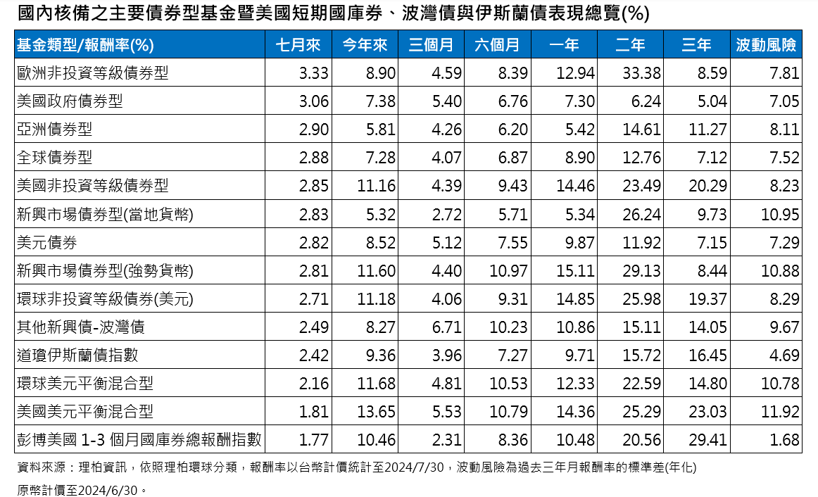 至於主要債券及平衡型基金,7月齊揚,其中,歐洲非投資級債基金還額外受惠於歐洲央行降息題材,漲幅達3.33%居冠,其次是美國政府債基金上漲3.06%。