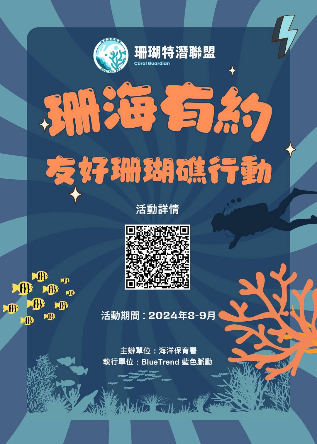 海保署表示,今年已培訓60位「珊瑚特潛聯盟」潛水教練,希望藉由潛水教練的行動與專業,在帶領潛水員執行潛水計畫時,將珊瑚知識融入潛水前的解說導覽,以建構民眾的海洋保育意識。今年首次推出的「珊瑚生態永續課程」將與全臺20家「珊瑚特潛聯盟」業者攜手合作,共有20場次,報名者須備有初階潛水員證照,活動將補助每人新臺幣1,000元(包含2支氣瓶、解說費及潛水保險),即日起民眾可於「珊海有約-友好珊瑚礁行動預約」網站線上報名。