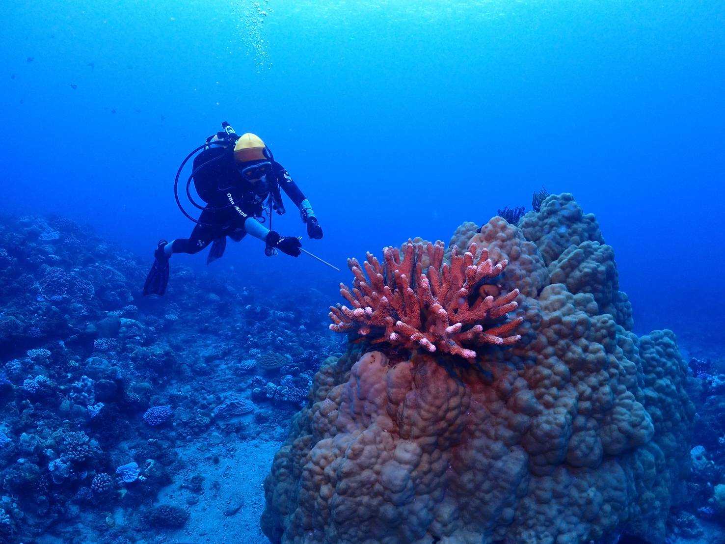 ↑圖說:潛水員依教練指示尋找柱型珊瑚(圖片來源:海洋保育署提供)