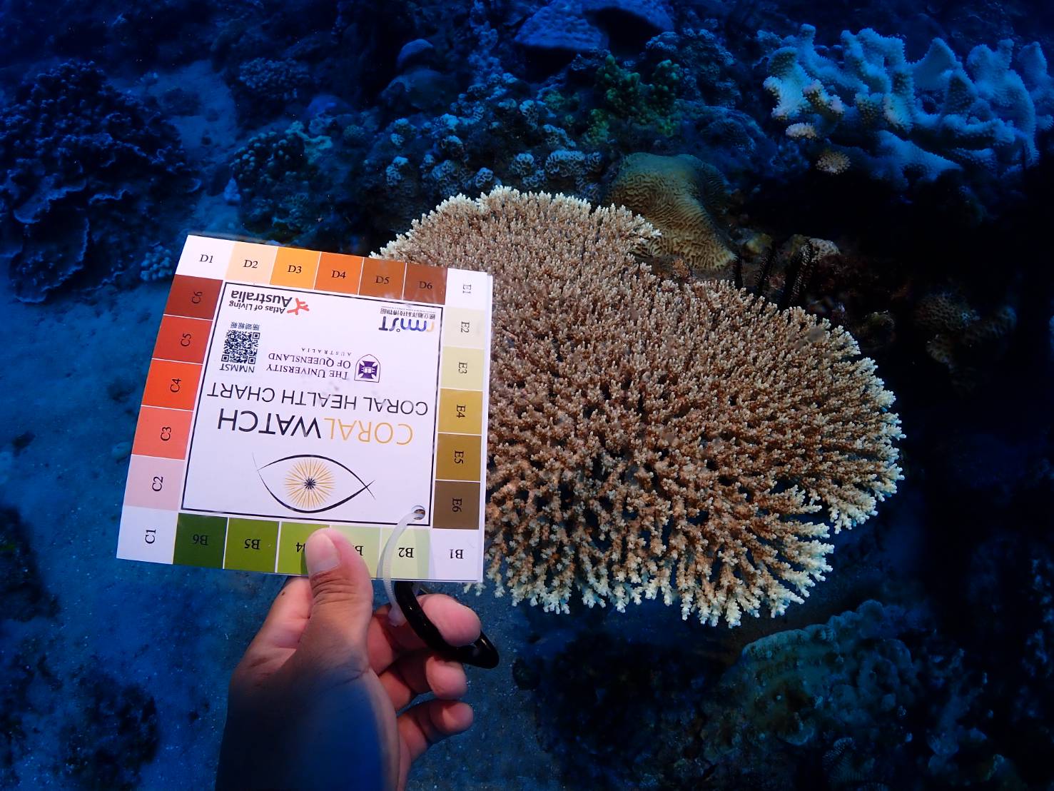 ↑圖說:使用coral watch色卡記錄該株珊瑚之健康程度(圖片來源:海洋保育署提供)