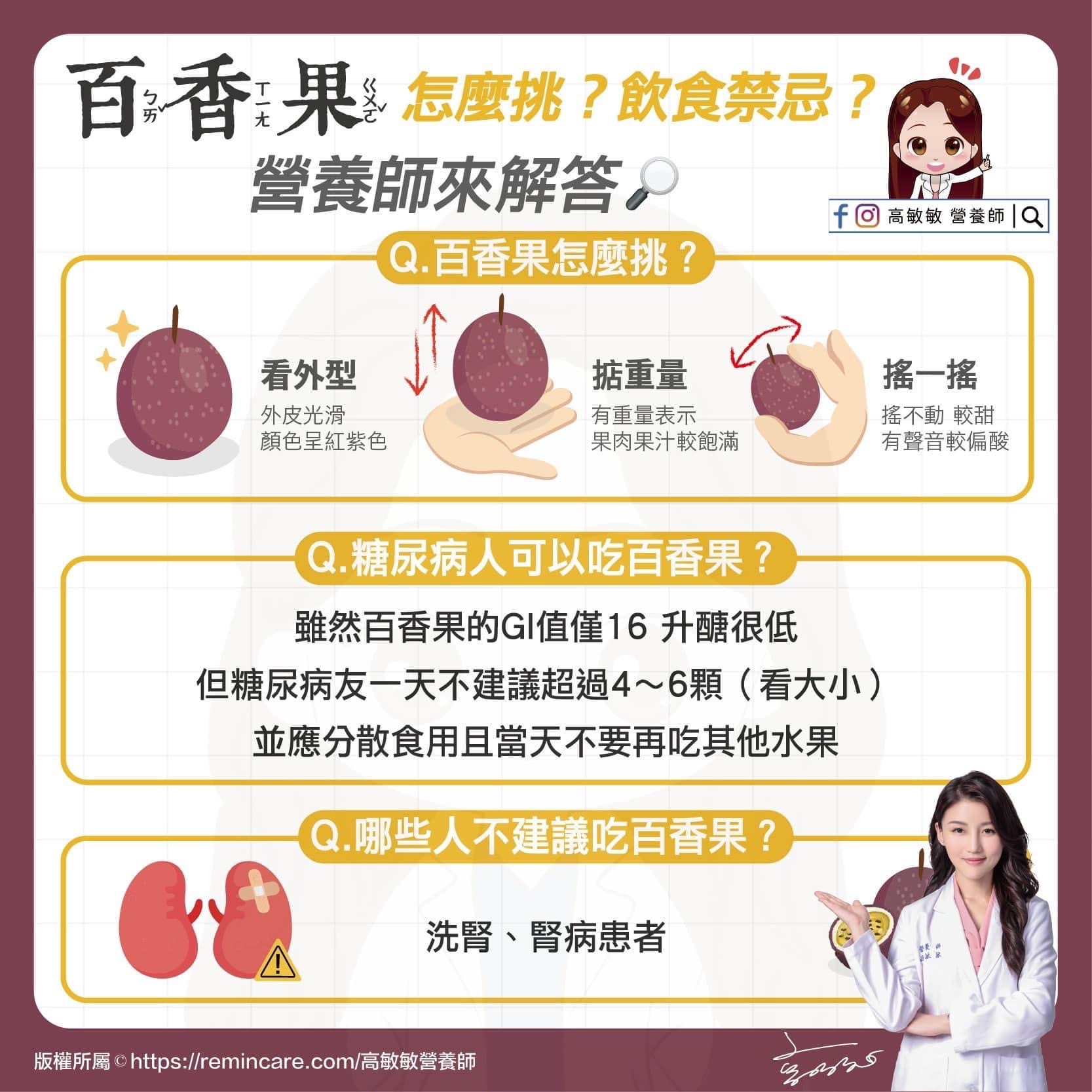 雖然百香果的GI值僅16升醣很低,但糖尿病友一天不建議超過4~6顆(看大小),並應分散食用且當天不要再吃其他水果