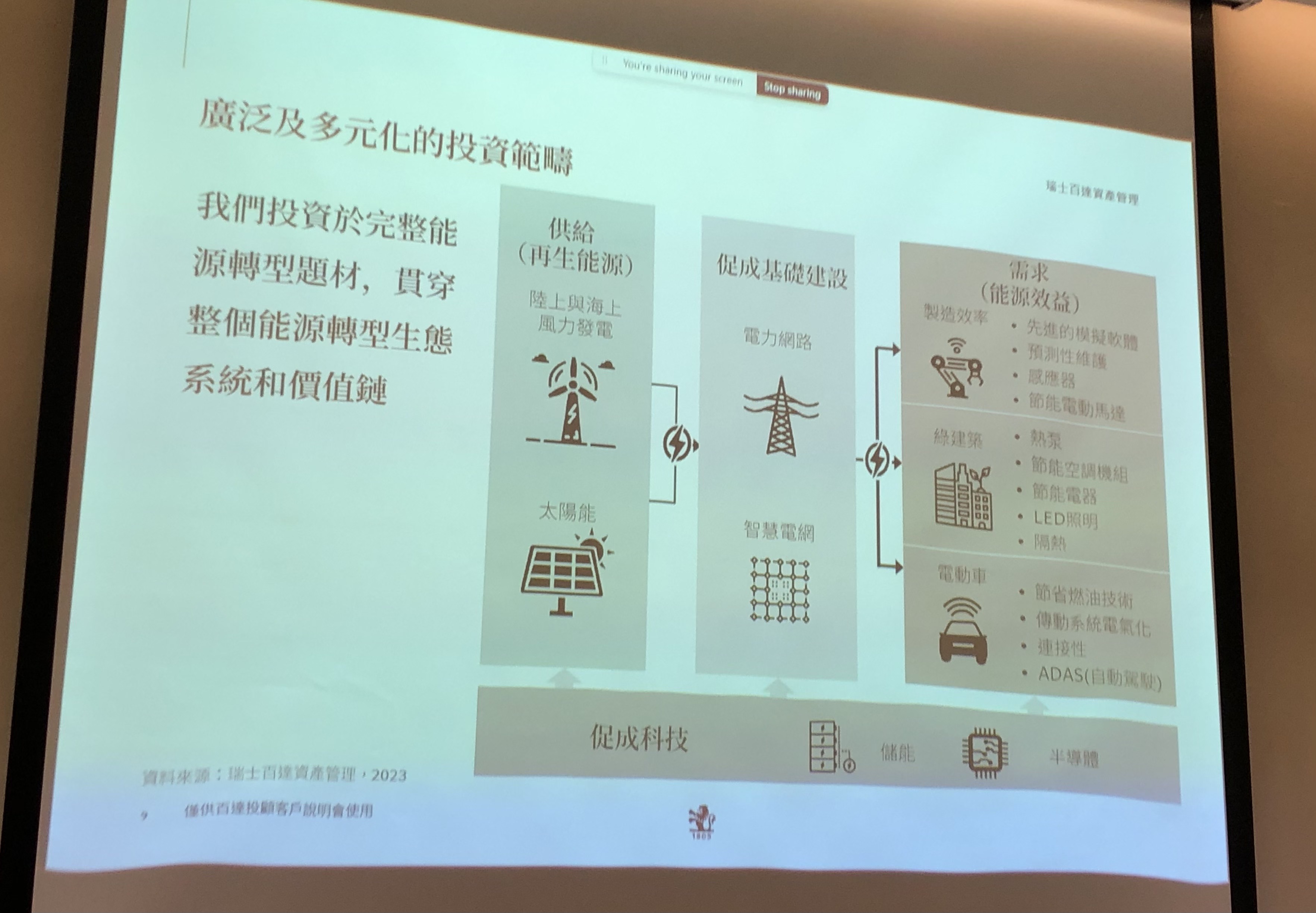基於上述觀點,百達能源轉型策略,因此佈局在開源、節流與新科技(如上圖,記者李錦奇攝影),其中,開源著重於再生電力生成、節流著墨於綠建築與電動車等有利能源效率的產業發展、新科技則是聚焦在能夠促成再生電力發展以及提高能源效率的促成科技。