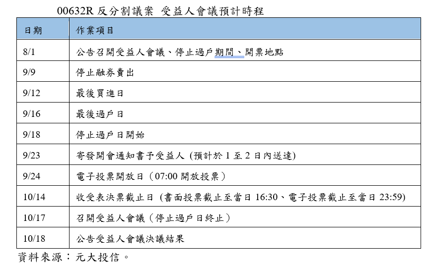 00632R反分割議案將於10月17日以書面方式召開受益人會議,00632R持有人於9月23日起將收到開會通知書,可選擇書面投票或透過「集保e手掌握」、各大證券下單app進入集保電子投票平台投票,約數分鐘內即可完成,惟須留意電子投票時間為9月24日至10月14日晚間24時止。